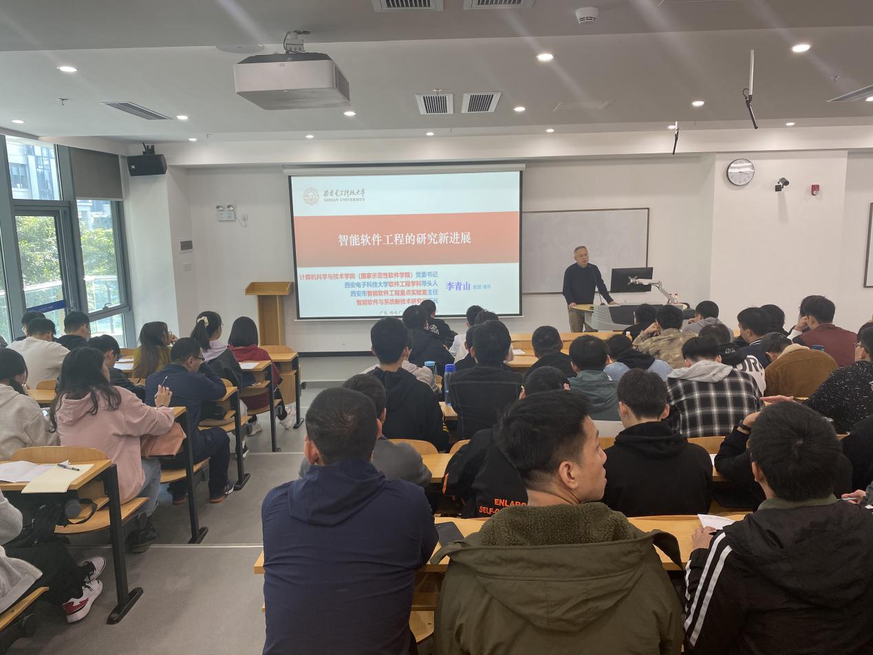 座谈会后,李青山书记作为西电软件工程学科带头人、西安市智能软件工作重点实验室主任、智能软件与系统新技术研究所所长,受邀向广研院的230余名全体研究生在黄埔区海丝知识中心B5栋205教室作了题为“智能软件工程的研究新进展”的学术报告,报告从智能软件工程的技术与产业应用的角度,对学术研究与产业应用进行了全面阐述。广州研究院执行院长沈八中、党委副书记刘涛以及相关教师一起聆听了讲座。