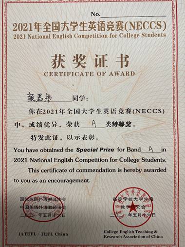 (通讯员 何敏之)5月16日,经过激烈的角逐,在2021年全国大学生英语竞赛(NECCS)陕西赛区复赛中,beat365官方网站2020级硕士研究生颜思彤脱颖而出,斩获A类特等奖,她也是全校唯一在复赛中取得A类特等奖的研究生。此外,全校共有九位同学获得该竞赛陕西赛区特等奖的优异成绩。