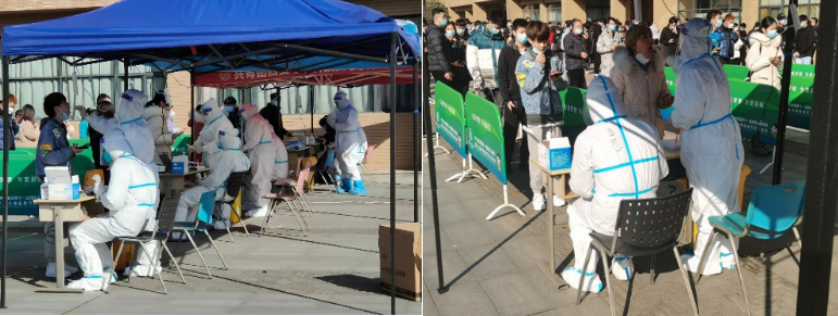 为支援工作人员,高效有序做好北校区教学区全员核酸检测,学院第一时间组建研究生疫情防控志愿者队伍。辅导员一呼百应,短短时间就有169名研究生志愿者报名,其中有党员132人。23日清晨,32名同学穿上防护服,经过培训后变身最可爱的“大白”,在寒冷的室外辅助工作人员进行检测工作。南校区抗疫一线,本科生党员同学也冲在前面。在21日的全员核酸检测工作中,26名志愿者同学穿上防护服协助工作人员,其中党员有24人。因为检测任务较重,第一组志愿者从早上9点多开始工作,不吃不喝坚持战斗到下午3点。同学们却都说“不辛苦,其他人更辛苦”。