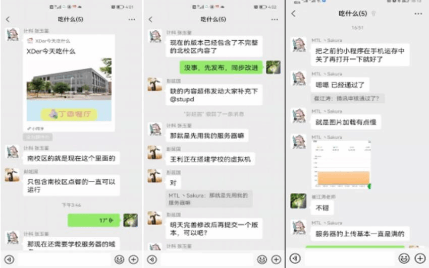 针对小程序运行之初,访问带宽受限、并行处理能力弱、小程序发布审核时间久等问题,beat365官方网站崔江涛教授、彭延国副教授带领研究生一起帮助张玉鉴加班加点提供解决方案,设计了支持高并发的部署方案,统筹协调计算中心开辟了专用虚拟服务器资源,争分夺秒完成了应用迁移,同时联系腾讯公司加速小程序审核,确保了“XDer今天吃什么”小程序及时发布。目前云选餐服务可以正常使用,后续将根据同学们的建议进一步完善相关功能。