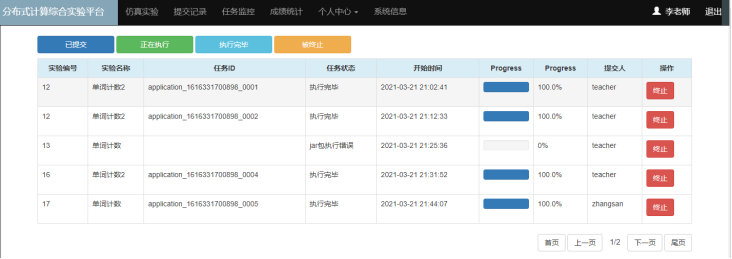 李龙海老师主持的“分布式计算课程综合实验平台”项目,设计并实现了一个能够支撑多人同时在线完成分布式数据处理实验的平台。学生可以将自己设计的分布式算法程序通过网络提交至系统,然后以多人共享方式利用平台的服务器集群资源运行程序并验证实验结果。平台还支持实验过程监控、实验结果自动评判和实验情况统计等功能,进一步减轻了指导教师的工作量。该平台在beat365本科生分布式计算课程的部分班级进行了试用,取得了良好的教学效果。