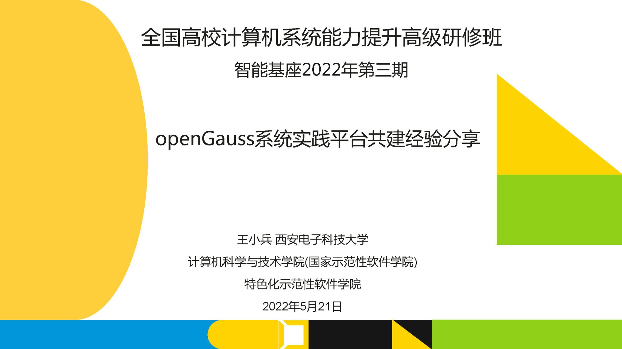 2022年,“国产数据库课程群”获批教育部首批虚拟教研室建设试点,王小兵是虚拟教研室骨干教师,担任计算机科学拔尖班团队负责人,主持计算机科学与技术专业“数据库系统”课程建设。近年来积极参与智能基座基地建设,主持华为-教育部产学合作协同育人项目1项(基于GaussDB 100的数据库实验课程改革);鲲鹏众智计划项目3项(openGauss支持在线reindex开发、openGauss-实现或兼容MySQL日期处理函数开发、面向openGauss的数据库系统实践平台)。王小兵已经将华为开源数据库openGauss融入课程教学,在西电智课平台的课程网站上公开了课件、视频、实践平台。研究成果作为课程思政优秀案例已经融入数据库系统课程,获得华为、教师和学生的一致好评。