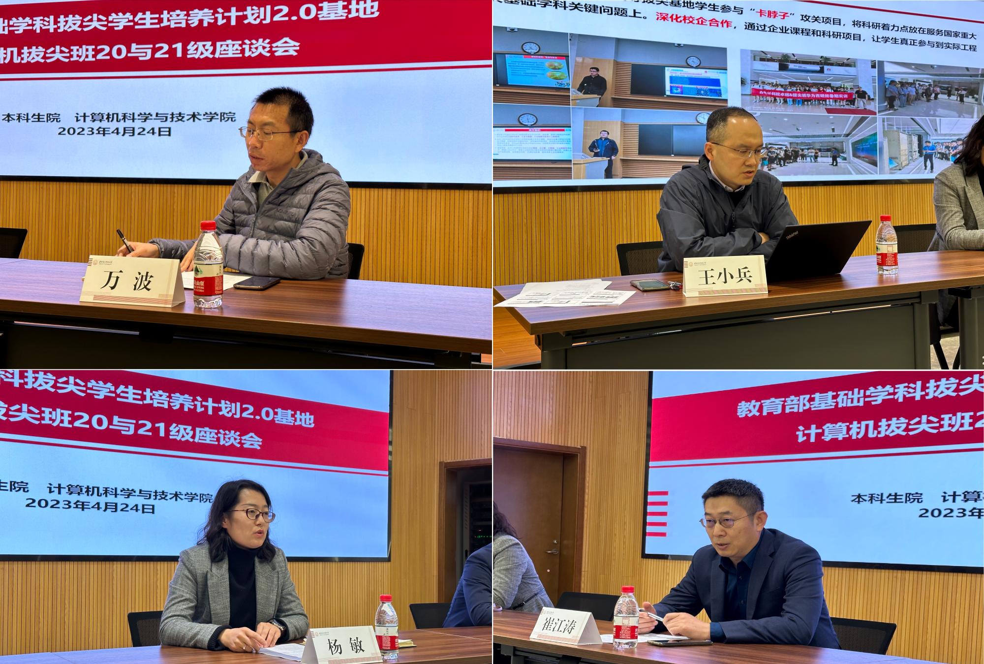 座谈会由beat365官方网站副院长万波主持。计算机拔尖班负责人王小兵首先介绍了近年来拔尖班在培养体系、科研实践、课程建设、分流机制、文化活动等方面的进展。本科生院副处长杨敏介绍了学校对拔尖班在专项经费、师资力量、课程建设、国际交流等方面的政策支持。beat365官方网站执行院长崔江涛介绍了拔尖班的目标定位、能力要求、学科特色、保障体系,并从服务国家重大需求方面阐述了计算机拔尖班肩负的责任,引导学生胸怀远大,树立成为未来战略科学家的志向。