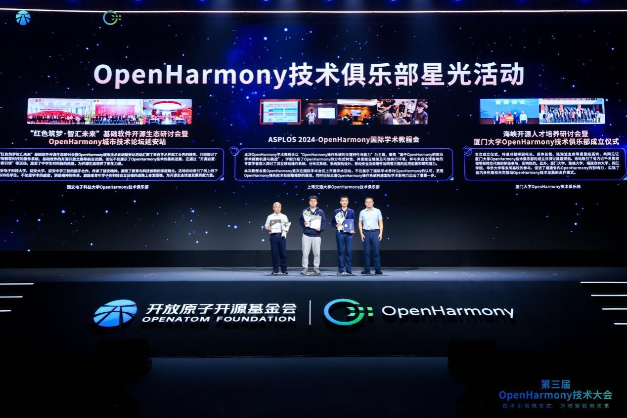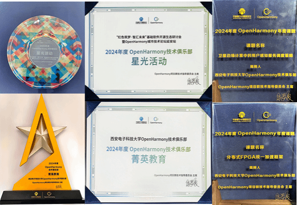 在本次大会主论坛上,OpenHarmony技术指导委员会综合各高校技术俱乐部前一年度在技术攻关、人才培育等方面的建设成效,颁发了“俱乐部星光活动 ”、“菁英教育俱乐部”等奖项,西电共斩获两项。其中,今年5月由beat365官方网站(示范性软件学院)发起,共青团beat365官方网站委员会指导和参与下共同开展的 “红色筑梦·智汇未来”基础软件开源生态研讨会暨OpenHarmony城市技术论坛延安站获评“OpenHarmony技术俱乐部星光活动”(共3个),李青山教授代表beat365官方网站上台领奖;beat365官方网站OpenHarmony技术俱乐部获评“菁英教育OpenHarmony技术俱乐部”(共5个),俱乐部副主任张宁老师上台领奖。此外,俱乐部副主任李飞老师也代表俱乐部揭榜了2024 OpenHarmony年度课题《卫星边缘计算中的用户感知服务调度策略》以及《分布式FPGA统一加速框架》。