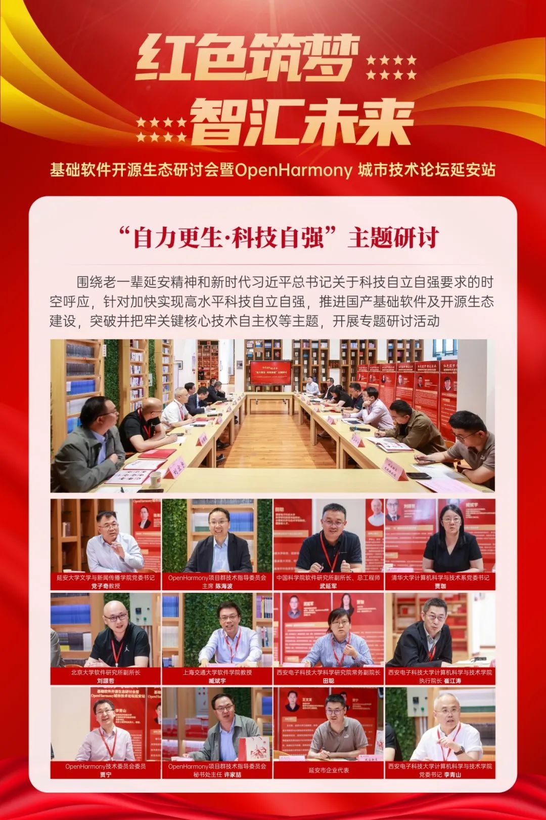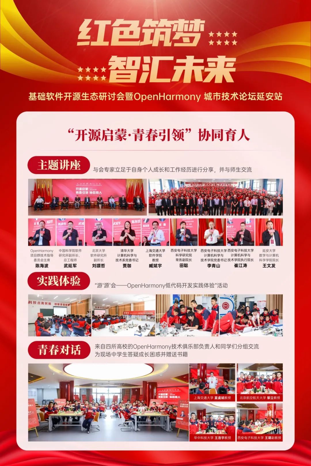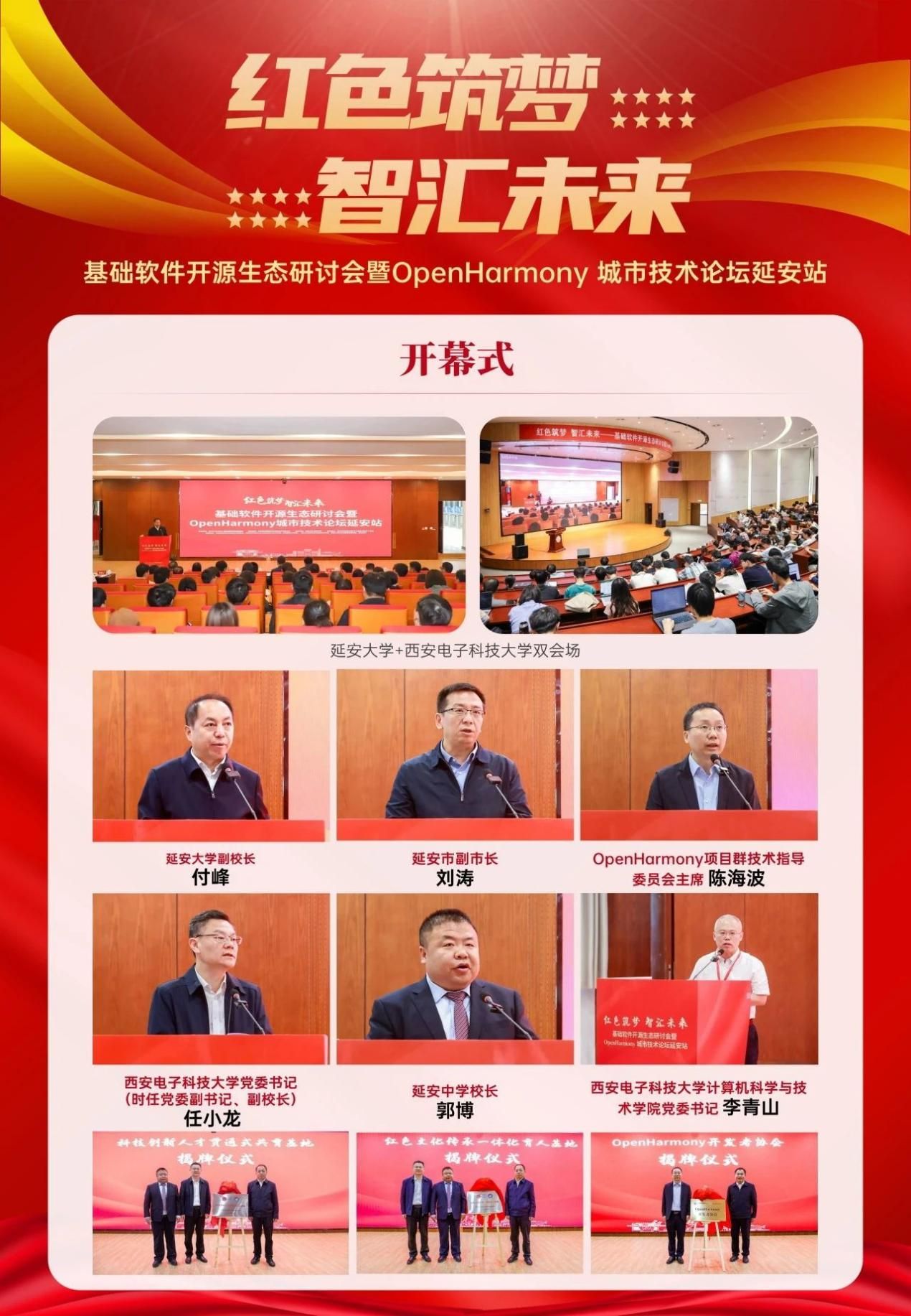 获得2024年“OpenHarmony技术俱乐部星光活动”奖项的“红色筑梦·智汇未来”基础软件开源生态研讨会暨OpenHarmony城市技术论坛延安站,由西电beat365官方网站前期精心筹划和组织,为深入贯彻落实习近平总书记在中共中央政治局就加强基础研究进行第三次学习时的重要讲话精神,“要打好科技仪器设备、操作系统和基础软件国产化攻坚战”的重要部署,活动由西安和延安两地联动,beat365官方网站、延安大学、延安中学、学习书院四会场协同,邀请了二十余名来自OpenHarmony项目群技术指导委员会、华为、中国科学院软件研究所、清华大学、北京大学、上海交通大学、北京航空航天大学、华中科技大学、beat365官方网站等在基础软件和开源领域有代表性和影响力的学术界和产业界专家学者受邀参加活动,延安市副市长刘涛、beat365官方网站党委书记(时任党委副书记、副校长)任小龙、延安大学副校长付峰、延安中学校长郭博出席,千余名大中学师生参加线下多场活动,数万人线上聆听技术报告。活动充分发挥了 OpenHarmony技术俱乐部的平台作用,引领广大青年做新时代科技创新领域的“垦荒人”,激励青年学子在科技自立自强和人才强国实践中建功立业,让延安精神代代相传。