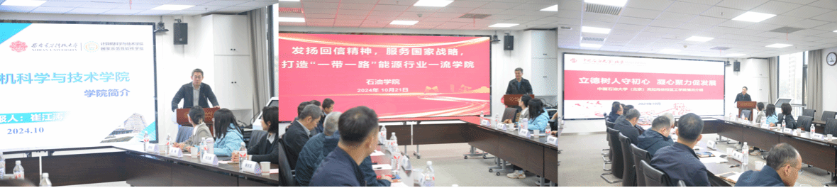 中石大克校区石油学院党委书记田守嶒以《发扬回信精神,服务国家战略,打造“一带一路”能源行业一流学院》为题介绍了石油学院创建学校标杆院系特色做法、打造多元师资队伍、服务新疆九大产业集群、打造应用型人才培养新模式等工作成效;工学院党委书记谢庆宾介绍了工学院全国党建工作样板支部和“双带头人”教师党支部书记工作室建设、多元师资队伍打造、特色优势专业建设、服务石油化工领域国家战略需求开展科学研究等工作情况,均谈到欢迎西电计科院多多选派优秀教师来到校区,促进青年教师成长,加强双方合作交流。