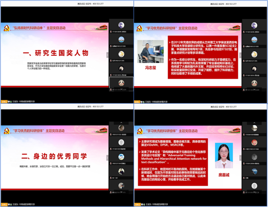 活动开始,青年委员王旭东首先为大家介绍了一些取得了优异成果的优秀研究生榜样及支部内的优秀党员榜样,带领大家学习他们的科研心得和精神,并表示学生党员更应该在学习科研中发挥带头作用,不忘初心,持之以恒,做好科研,做出表率,为建设科技创新型国家而努力。