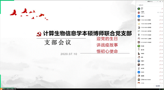 (通讯员 胡洁)2020年7月10日下午,计算生物信息学本硕博师联合党支部采用线上的方式进行了一次以“迎党的生日、讲战疫故事、悟初心使命”为主题的组织生活会,会议由组织委员张清杨主持。