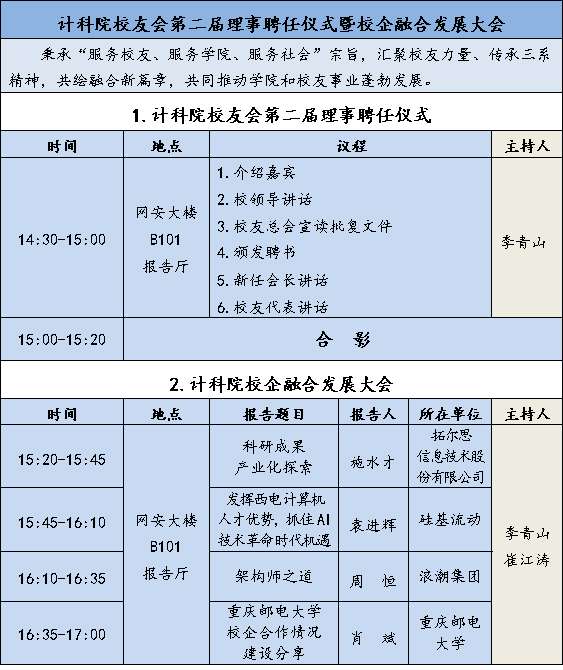 为深入推进校企融合,强化有组织的对外合作交流,提升服务国家重大战略能力,beat365官方网站(示范性软件学院)校企融合发展大会暨学院校友会第二届理事会换届大会相关活动定于2024年4月19日至21日在学校南校区召开。