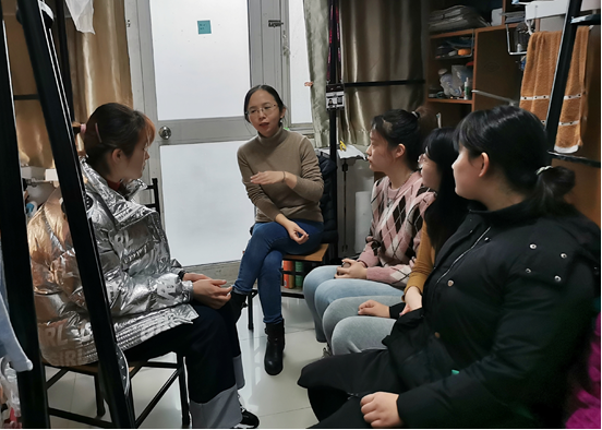 12月11日,学院党委副书记张莹莹走进海棠公寓7号楼530宿舍,针对就业择业问题与宿舍全体同学进行深入交流。三年级的同学正处于选择的关键时刻,张莹莹勉励大家慎重选择人生方向,下苦功,强信心,加强与师长的交流沟通。