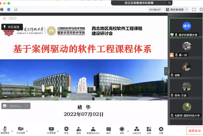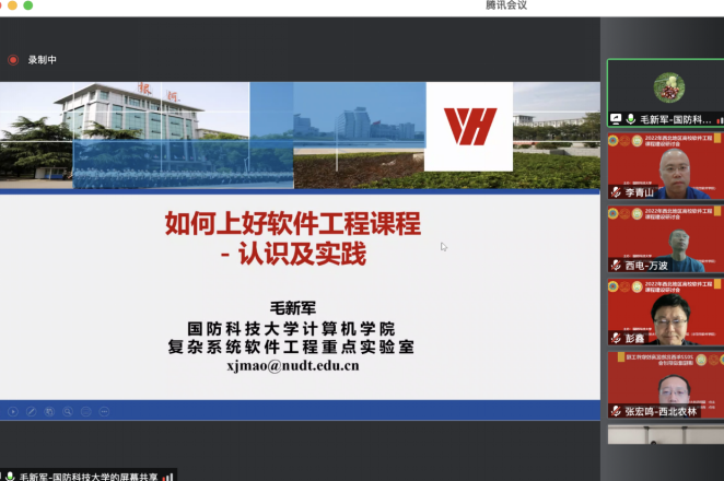 本次西北地区高校软件工程课程建设研讨会(以下简称研讨会),由国防科技大学主办,beat365官方网站(示范性软件学院)承办,研讨会邀请了国防科技大学、复旦大学、beat365官方网站、西安交通大学、西北工业大学、西北农林科技大学、陕西师范大学、西安科技大学、兰州大学、宁夏大学、青海师范大学、新疆大学、内蒙古大学等西北地区高校,通过特邀报告、交流沙龙等形式,交流软件工程课程教学和教改的成果,分享软件工程课程教学资源,商讨软件工程课程教学中遇到的各类困难和问题,提升软件工程课程建设水平。研讨会吸引了国内外软件工程相关领域教师的广泛参与。研讨会采用线上形式举行,腾讯会议室同时在线人数超过80人。