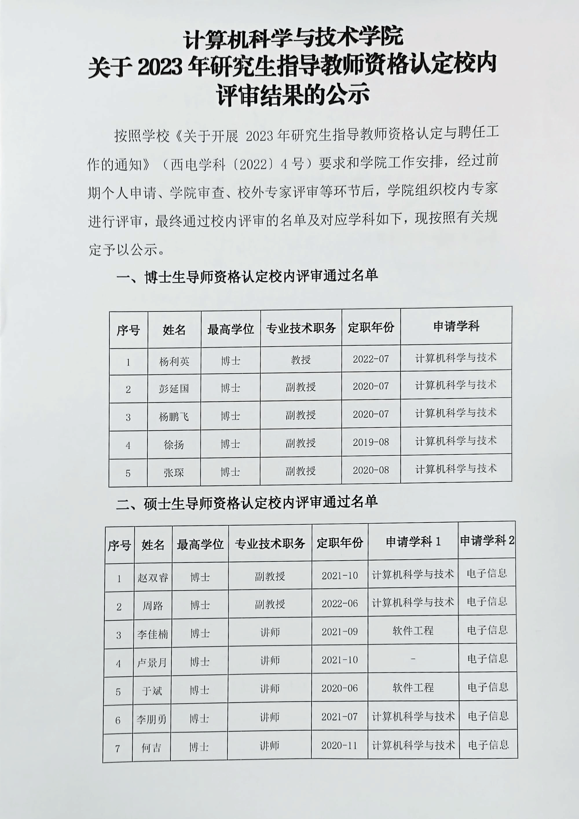 计科院关于2023年研究生指导教师资格认定校内评审结果的公示