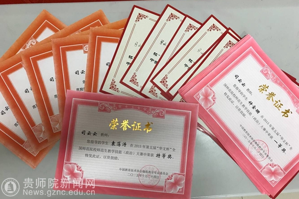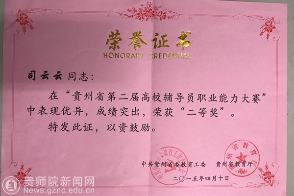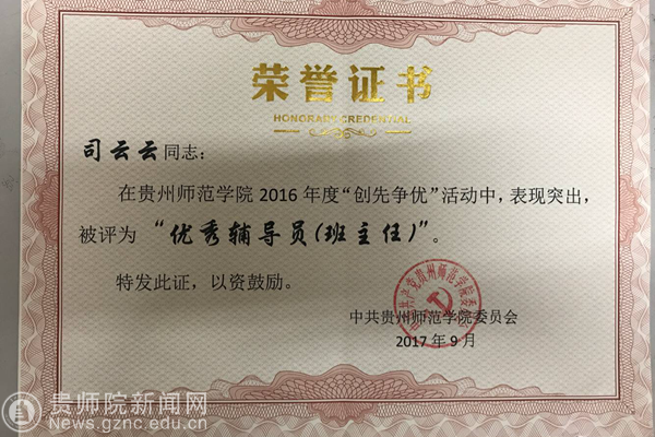 她认真学习《best365手机版官方网站辅导员工作手册》、《中共best365手机版官方网站党员发展细则》等文件,对照文件不断提高自身的工作能力,并且积极参加贵州省辅导员职业能力大赛,以比赛促成长,获得了第二届职业能力大赛二等奖的好成绩。同时她发挥自身课程与教学论的专业特长,对思政专业学生进行师范学生职业能力培养,其指导学生在全国“华文杯”职业能力大赛中获1个特等奖、3个一等奖、15个二等奖。