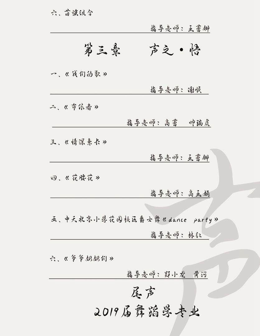 大学四年转瞬即逝,音乐舞蹈学院2019届舞蹈毕业班即将踏上人生的征途,在此我们要为“舞”而"声”,为“舞”而“悟”。大学期间,我们不断拼搏,不断努力,挥洒汗水,为的就是我们最后一舞。在四年里,从对舞蹈的初步认识直至现在每位同学都有着自己对舞蹈独特的认识,更有对舞蹈声音独特的见解。在这里,2019届毕业班将用“舞蹈的声音”给大家献出最精彩的汇报。