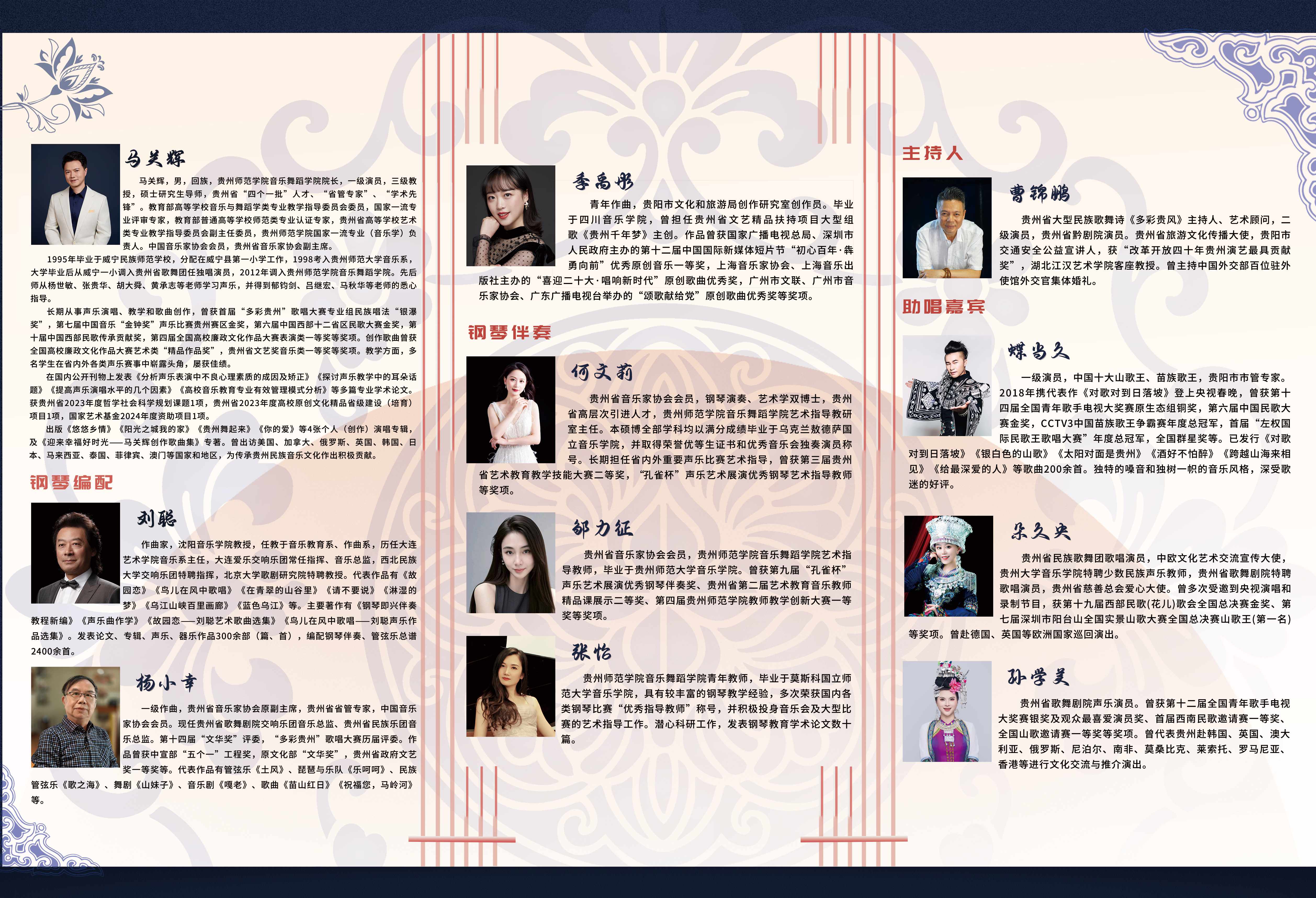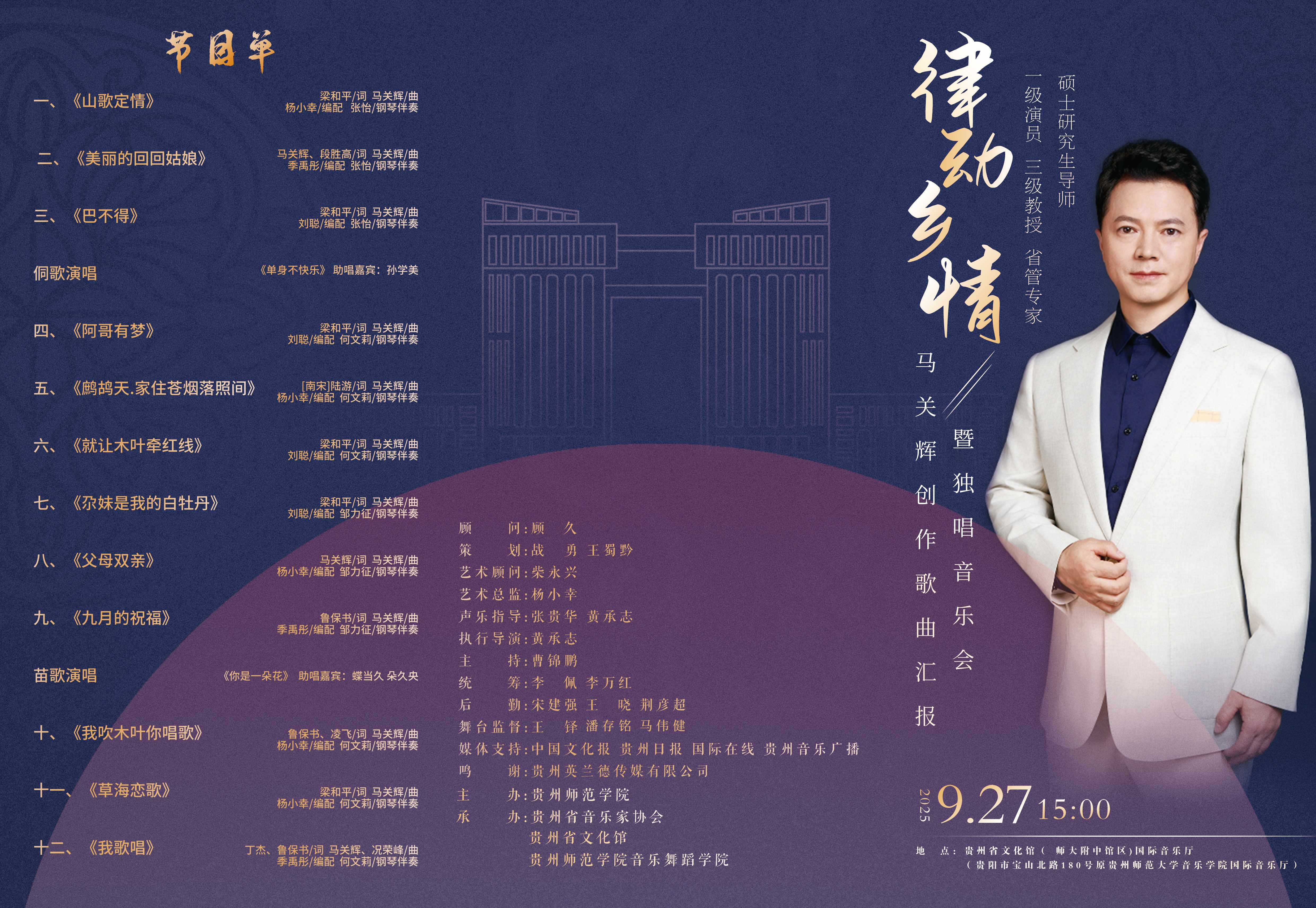 马关辉,回族,中共党员,男高音歌唱家,best365手机版官方网站音乐舞蹈学院院长。国家一级演员,三级教授,硕士研究生导师,贵州省“四个一批”人才、“省管专家”、“学术先锋”、“教育系统工作表现突出个人”。教育部高等学校音乐与舞蹈学类专业教学指导委员会委员,国家一流专业评审专家,教育部普通高等学校师范类专业认证专家,音乐学国家一流专业负责人,贵州省高等学校艺术类专业教学指导委员会副主任委员,中国音乐家协会会员,贵州省音乐家协会副主席。 1995年毕业于威宁民族师范学校,分配到威宁县第一小学任教;1998年考入贵州师范大学音乐系,师从张贵华教授学习声乐,2003年以专业第一名的好成绩毕业于贵州师范大学,同年调入贵州省歌舞团任独唱演员,2012年6月调入best365手机版官方网站。先后师从杨世敏、张贵华、胡大舜、黄承志等老师学习声乐,演唱博采众家之长,形成了音域宽广流畅,音色纯正甜美,感情淳朴真挚,风度卓而不群,于洒脱中见细腻,在热烈中蕴深沉的演唱风格,深受人民群众的喜爱。 长期从事声乐教学和歌曲创作,曾获首届“多彩贵州”歌唱大赛专业组民族唱法银瀑奖,第四届、第六届、第七届中国音乐“金钟奖”声乐比赛贵州赛区金奖,第六届中国西部十二省区民歌大赛金奖,第十届中国西部民歌传承贡献奖,第四届全国高校廉政文化作品大赛表演类第一名;创作歌曲曾获全国高校廉政文化作品大赛艺术类“精品作品奖”,贵州省文艺奖音乐类一等奖等奖项。 曾在国内公开刊物上发表多篇专业学术论文,代表作有:《分析声乐表演中不良心理素质的成因及矫正》《探讨声乐教学中的耳朵话题》《提高声乐演唱水平的几个因素》《高校音乐教育专业有效管理模式分析》等。 出版《悠悠乡情》《阳光之城我的家》《贵州舞起来》《你的爱》等4张个人演唱专辑,出版《迎来幸福好时光——马关辉创作歌曲集》专著一部;课题《贵州红色音乐文化传承研究》获贵州省2023年度哲学社会科学规划课题,歌曲《我在乡村迎接你》获国家艺术基金(一般项目)2024年度资助项目。 代表国家文化和旅游部出访美国、加拿大、俄罗斯、英国、韩国、日本、马来西亚、菲律宾、澳门等国家和地区,为传承贵州民族音乐文化作出积极贡献。