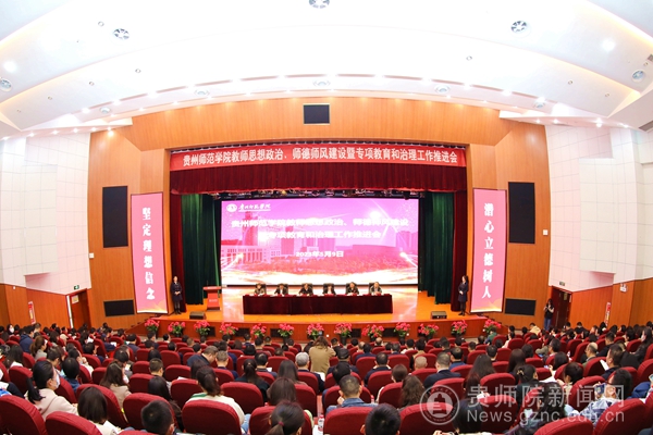本网讯 为深入学习贯彻落实党的二十大精神,认真学习习近平总书记关于教育的重要论述特别是关于教师工作的重要指示批示精神,全面提升学校师德师风建设水平,结合教育厅有关师德师风专项教育和治理工作要求,5月9日,学校在逸夫楼演播厅召开教师思想政治、师德师风建设暨专项教育和治理工作推进会。全体在家校领导和校党委委员出席会议。会议由校长韦维主持。