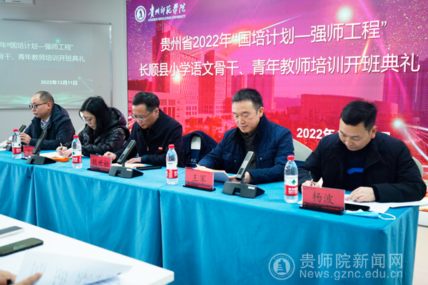 本网讯 2022年12月11日,贵州省2022年“国培计划——强师工程”长顺县骨干教师学科培训(小学语文)开班典礼在学校综合楼顺利举行。校党委副书记熊世桓,教师工作部部长王茜,文学与传媒学院党委书记王军、院长杨波、各班班主任老师、学生助理及全体参训学员参加了本次开班典礼,典礼由文学与传媒学院李明勇老师主持。