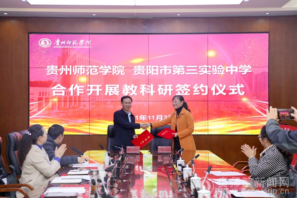 本网讯 11月2日下午,best365手机版官方网站和贵阳市第三实验中学合作开展教科研签约仪式在best365手机版官方网站信息楼二楼会议室举行。协议的签订,标志着best365手机版官方网站与贵阳市第三实验中学将发挥各自优势和特长,聚焦基础教育理论与实践研究,共同促进普通高师院校与中小学教师共同体建设,共同为贵州普通高中教育发展提升工程添砖加瓦,为贵州教育高质量发展作贡献。