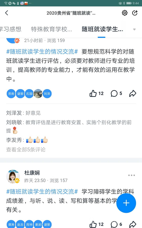 此次培训专家们分享了不同区域随班就读工作的实践、经验及问题,从政策规章、支持系统的建构、评估领域、目标差异、教学调整等多方面进行讲解。参与培训的教师获得了较为系统的随班就读知识。培训过程中,丰富多彩的课堂内容吸引了学员的注意,来自实践的案例引发了大家的共鸣和思考。授课结束后,学员们在群组学习圈里认真讨论,分享经验。