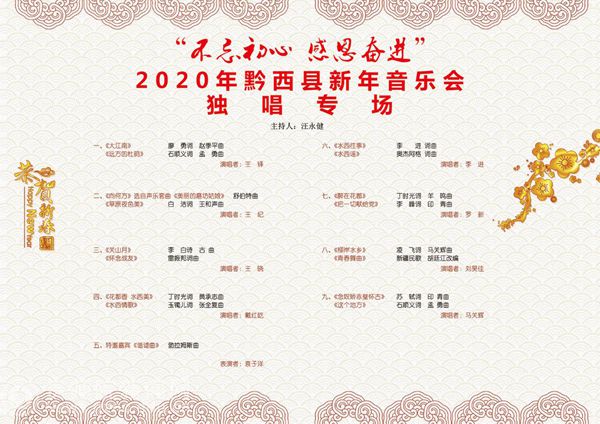 据悉,黔西县2020年新年音乐会由中共黔西县委宣传部主办,黔西县教育科技局、黔西县文体广电旅游局承办。为了使更多的音乐爱好者能够在场外观看到音乐会,主办方通过“人文水西”网络平台进行了音乐会现场实时高清直播。