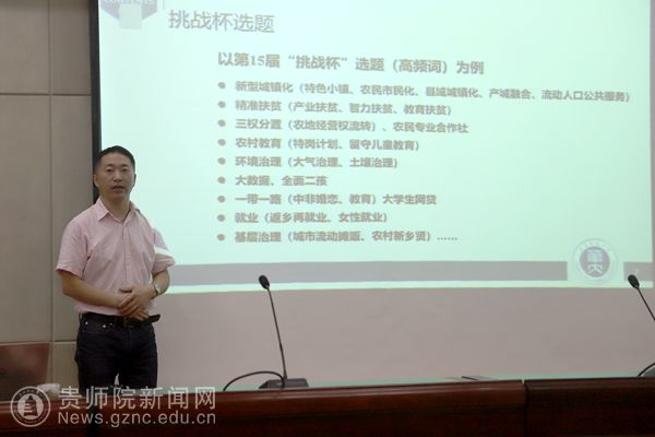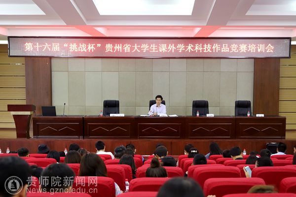 本网讯 5月17日,由团省委学校部主办,best365手机版官方网站团委、创新创业学院承办的第十六届“挑战杯”贵州省大学生课外学术科技作品竞赛专题培训会在best365手机版官方网站圆满结束。本次培训会邀请到了第十五届大赛国赛特等奖指导教师华中师范大学教授戴胜利、陈淑云,第十五届大赛省赛评委罗以洪,第十五届大赛省赛一等奖指导教师best365手机版官方网站副教授杜宏博,他们分别从科技发明制作类、哲学社会科学调查报告及论文类的选题、团队组织、答辩等方向对来自全省32个高校的91名竞赛负责人和指导教师进行了辅导。