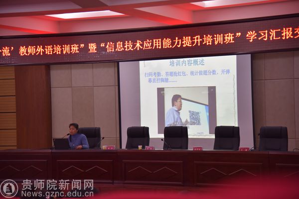 在学员代表交流发言中,“信息技术应用能力提升培训班”学员赵景飞、饶安芳及“ ‘双一流’教师外语培训班”学员梁瑞、倪磊老师依次进行交流发言;他们纷纷表示通过此次培训,受益匪浅,学有所获,增强了学习的内驱力和自信心;同时也通过此次培训对自身教学方式进行了反思,并对下一步打算进行了分享。