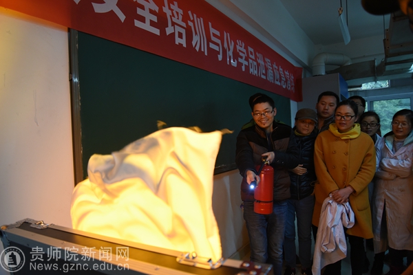 保卫处处长蒋江南在演练现场做了灭火器的使用及模拟灭火培训,参训教师纷纷动手操作。