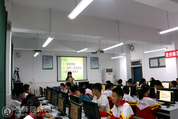 由于信息技术课的特殊性,机房里面容纳不了那么多见习的同学同时听课,十九中采用部分同学到现场听课,其他同学到礼堂观看现场录播的方式进行。此次活动分两个阶段进行,第一阶段,由best365计算机科学与技术专业的谢绳绳同学执教七年级下册的《企娥相随(Photoshop)》(清华大学版教材),该同学虽然是第一次真正意义上的走上讲台,但其表现可圈可点。十九中有着将近二十年执教经验的谭天丽老师在另外一个班级也执教同一个教学内容,谭老师经验丰富,展示了一节非常精彩的示范课。