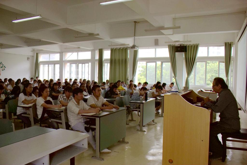 孟子云:“耳目之官不思,而蔽于物。物交物,则引之而已矣。心之官则思,思则得之,不思则不得也。此天之所与我者。先立乎其大者,则其小者不能夺也。此为大人而已矣。”袁本良借此句向同学们介绍了谓词性功能的否定代词“否”字的词性,以及《岳阳楼记》、《小石潭记》、《陋室铭》的部分词义和句义。