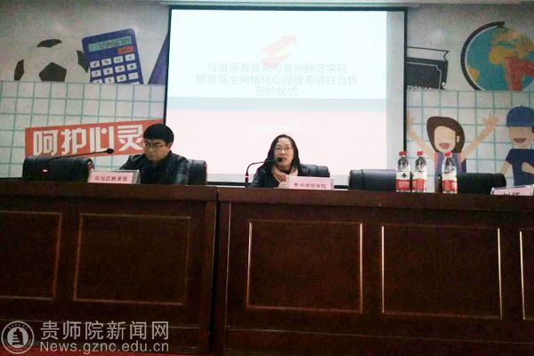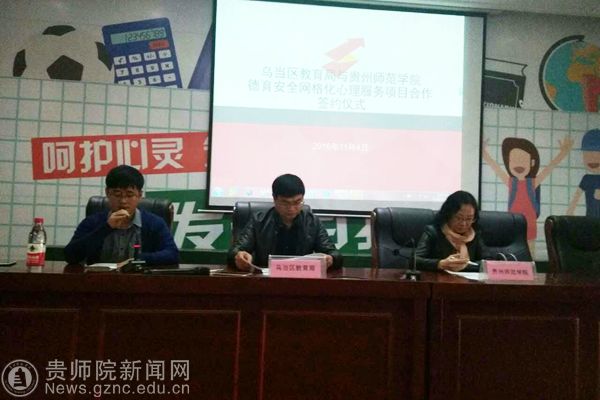 本网讯 11月4日上午,best365教育科学学院刘红院长、倪磊、唐辉一老师及2014和2015级应用心理学36名优秀大学生一行来到新天学校,参加乌当区教育局与best365手机版官方网站德育安全网格化心理服务项目合作签约仪式,出席会议的还有乌当区教育工委李波副书记、区教育局团委书记刘丽,以及乌当区各中小学校长或负责人等。
