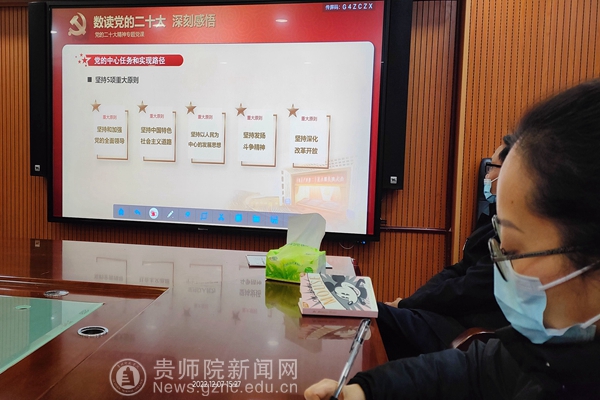 邹晓青首先从美设学院到师院的发展从小到大,由弱到强谈起,上升到贵州十年来日新月异,延伸到国家实力不断的增强;从个体发展到民族命运的发展,这都离不开我党百年来的不断挫折与积累,离不开我党的绝对领导,因此党的二十大具有不同凡响的重要意义。专题党课分三部分进行,第一部分为数读党的二十大,深刻感悟;第二部分为党建引领,深学笃行。第三部分为锐意创新、团结奋斗。她在第一部分系统地解读二十大精神,分别对大会主题、过去十年的成就与经验、党的中心任务和实现路径三个方面作概括和讲解。第二、三部分结合学校情况,学院特点,贯彻落实党的二十大精神,在新时代下立德树人的重要性,尤其是教育、科技、人才强国的重要性认识与落实,实现学院新的发展提出了要求和建议。