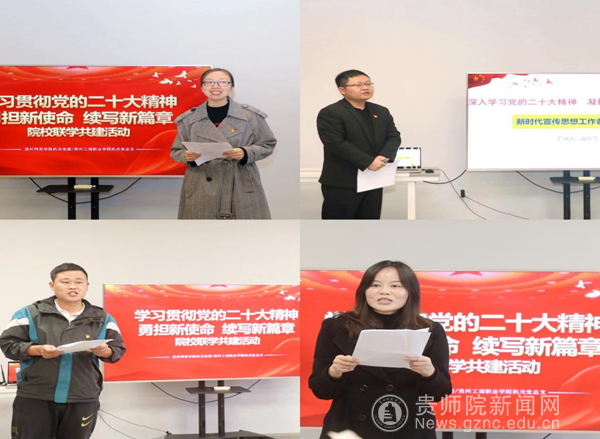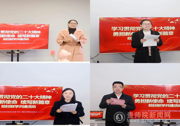 首先,伍少萍介绍了两校参加本次联学的同志,接着贵州工商职业学院党委副书记、副校长刘焰同志代表学校致欢迎辞,然后,best365机关党委书记周永杰介绍今天联学共建活动的内容。在联学共建活动中,首先由best365机关党委书记周永杰领学《中国共产党第二十次全国代表大会关于十九届中央委员会报告的决议》;接着,贵州工商职业学院机关党委总支书记伍少萍领学《中国共产党第二十次全国代表大会关于<中国共产党章程(修正案)>的决议》;再接着best365机关党委委员、人事处副处长赵玉领学《人民日报社论:团结奋斗,谱写新时代中国特色社会主义更加绚丽的华章》;再接着贵州工商职业学院机关党总支副书记、第二支部书记雷雪领学《高举中国特色社会主义伟大旗帜为全面建设社会主义现代化国家而团结奋斗》。领学完毕后,best365党委委员、组织部部长杨昌顺作了《关于深刻把握“六个必须坚持”的理论价值和践行要求》的主题发言。他在深入学习党的二十大报告、全面贯彻党的二十大精神的基础上,结合自身工作实际,深刻阐释了坚持人民至上、坚持自信自立、坚持守正创新、坚持问题导向、坚持系统观念、坚持胸怀天下的理论价值,并呼吁广大党员干部要认真践行“六个必须坚持”,永葆政治本色。然后双方就学习贯彻党的二十大精神进行交流学习。best365机关党委第十三党支部付汝霞、第九党支部齐新宇、第六党支部姚茂云、第五党支部官鹏飞;贵州工商职业学院机关第三党支部徐琳、党总支组织委员彭韵结合自身工作实际,分别作了交流发言。同时双方与会同志还就两校机关党建高质量发展中遇到的难点、痛点和薄弱点,以一问一答的形式进行了交流。