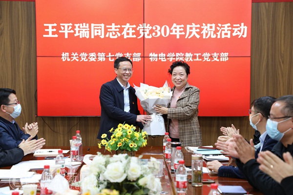 原教学实验管理中心刘敏、原物理系1992级物理班杨永忠通过视频表达了对曾经的良师益友的回忆和祝福。视频观看结束后,大家纷纷谈了自己与王平瑞曾经的交集与感受。物电学院基层党委书记熊德永表示王平瑞同志为物电学院的发展倾注了大量的心血,希望退休后继续关心物电学院的发展,常回“家”看看。青年教师代表李振宇博士读了自己写给王平瑞的一封信,他表示王平瑞同志是一位好领导,工作竭尽全力、敢于担当,平易近人,关心同事,对自己和很多年轻教师的成长给予了很大帮助。一句“我从来不怕王老师打电话给我,也从来不怕给王老师打电话”瞬间让人破防。研究生院院长余乐正表示,自己见证了王平瑞同志为学校科研、申硕、学科建设、联合培养研究生等多个方面作出的努力和成效,王平瑞同志是年轻党员、教职工学习的榜样和模范。校党委副书记熊世桓为王平瑞同志送上了祝福,感谢她对学校工作作出的贡献,祝愿她新的人生征程别样精彩。科研处副处长李佩、教务处副处长聂冬梅、物电学院党委副书记于治鳞及参加党建活动的老师们都纷纷表达了对王平瑞或景仰或感恩或祝福的感情。每到动情处,都忍不住留下感激、不舍、幸福的泪水。