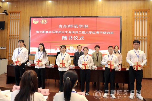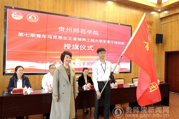 在庄严的国歌声中,学校第七期“青年马克思主义者培养工程”大学生骨干培训开班仪式正式开始。仪式上,郭亚宣读本次培训须知,罗荣宣读临时团支部委员名单。熊志光为第七期培训班授班旗,薛璞授青马宣讲团团旗,刘红玲授青马实践团团旗;全体参会领导为学员代表赠授学习图书。