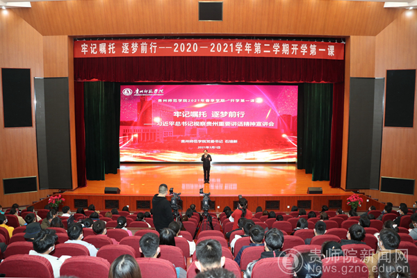 本网讯 3月1日,校党委书记石培新在逸夫楼演播厅为青年大学生上精彩而深刻的春季学期“第一课”,这也是贵州高校2021年新学期首场思政课。石培新从两个方面宣讲了习近平总书记视察贵州重要讲话精神,鼓励学生们赓续红色基因,锚定青春坐标,在实现中国梦的伟大征程中书写精彩的人生。