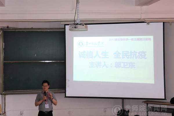 本网讯 6月29日,校党委委员、校纪委书记邬卫东到2017级生物科学专业(1)班开展了“诚信人生,全民抗疫”的主题团日活动。校团委副书记陆轴,学院党总支书记孙秀华、院长刘讯、副院长孟泽彬、学院党总支委员李育芳、何勇、学院学生党支部书记王溯参加活动。活动围绕着何为“诚信人生”“战疫分享”等两个方面开展,领导和老师激动人心的战疫分享,同学们认真聆听,活动效果良好。