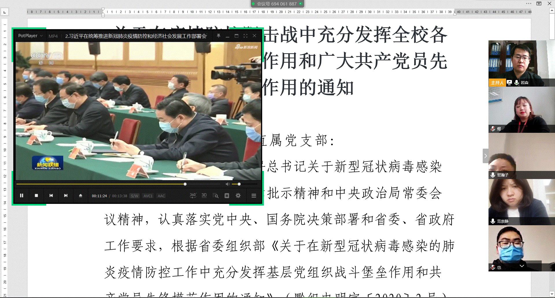 支部全体党员还深入学习了《关于加强党的领导、为打赢疫情防控阻击战提供坚强政治保证的通知》《关于在疫情防控阻击战中充分发挥全校各级党组织战斗堡垒作用和广大共产党员先锋模范作用的通知》《关于进一步加强疫情防控工作期间基层党建工作的通知》,传达学习了习近平在统筹推进新冠肺炎疫情防控和经济社会发展工作部署会议上发表重要讲话。