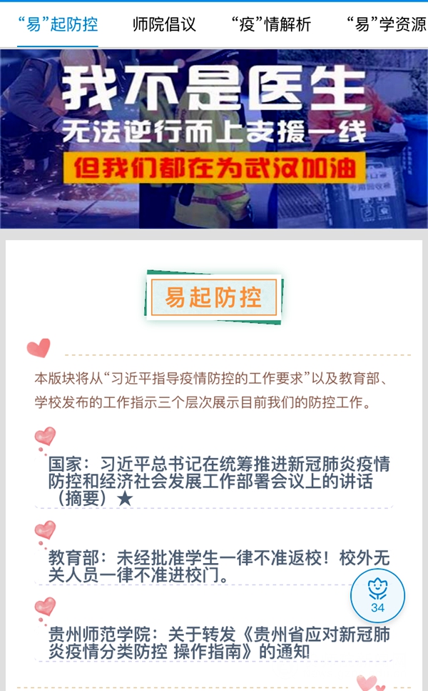 结合best365手机版官方网站“六在易班”内涵打造八个板块的思想政治教育网络展馆,板块分别是‘易’起防控、师院倡议、疫情解析、‘易’学资源、‘易’起健康、防疫报道、‘易’起加油、畅所‘易’言。通过思想引领、情怀培育、文化育人、创先争优、学习成长与生活服务等内容的融入,大力宣传防疫的进展和成效,营造良好的氛围,使教育润物无声,触及学生灵魂,并及时总结推广教育活动中的好经验、好做法,保证活动的针对性和实效性。思想政治教育网络展馆的具体内容为: