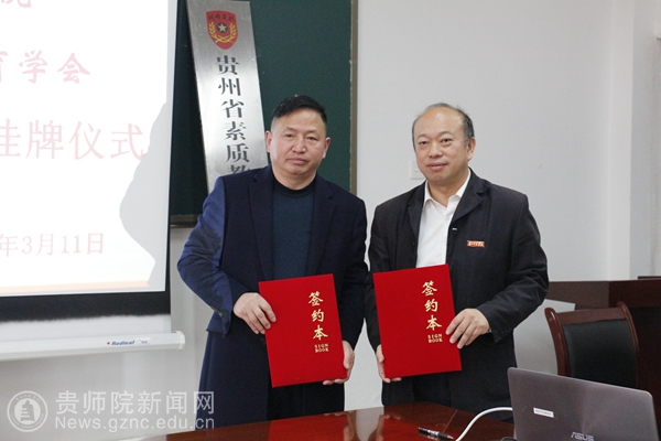 随后,校长郁钟铭与贵州素质教育学会法人代表韩锦铖签署了双方合作协议。韩锦铖把“贵州素质教育学会黄埔军校文焕研究会”牌匾授予给历史与档案学院。中国红色文化研究会文产研发中心秘书长紫秋向学会赠送了“兵魂”书法作品。最后,与会人员进行了合影。