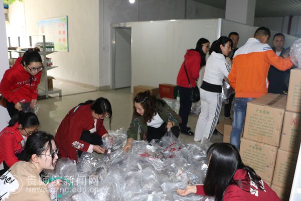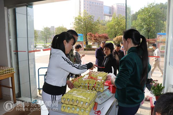 经过精心准备,4月3日清早,一辆来自印江县鹅岭关村的“扶贫农产品直通车”,将贫困户养殖的的乌骨鸡和绿壳蛋送到学校,在“校农结合直销点”举办农产品校园现场爱心销售活动,解决贫困户销路难题。