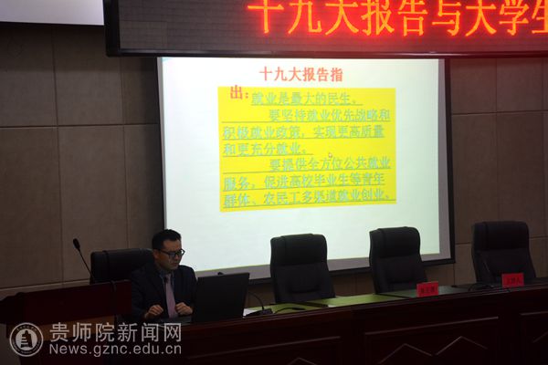 讲座上,陈正源用平实、精炼、幽默的语言从十九大报告出发,结合贵州省情、大学生就业等方面展开详细讲解,特别是对十九大报告中有关青年的部分内容深入讲解,并结合十九大所展现出的深刻变革与现场学生进行互动。整个讲座过程中,同学们仔细聆听,认真作笔记。