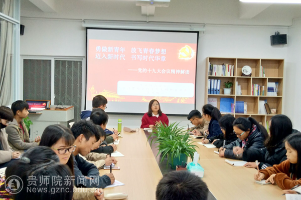 本网讯 为深入贯彻学习党的十九大精神,全面提高我院青年学子的思想政治觉悟,勇做新青年,放飞青春梦想,迈入新时代,书写时代华章。11月30日下午,best365手机版官方网站青年导师宣讲团成员吴光梅在兰园丽琼工作室开展关于党的十九大精神宣讲活动,材料科学与工程班30余人到场认真聆听了此次宣讲。宣讲会由化学与生命科学学院辅导员吴光梅主持。