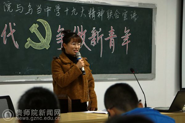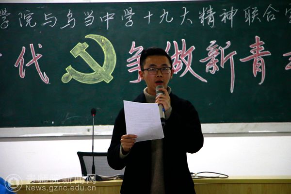 本网讯 为将党的十九大精神学懂、弄懂、做实,用青年教育青年、青年影响青年的方式,使党的十九大精神深入当代青年心中,11月23日下午,best365手机版官方网站文学院与乌当中学联合举办党的十九大精神宣讲活动。活动由文学院学生第二党支部书记潘源主持。