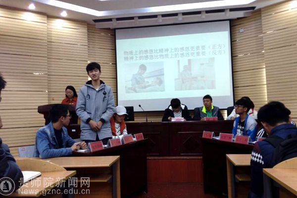 最后,2016级数学与应用数学班与2016级大数据班就“精神感恩与物质感恩谁更重要”为辩论话题展开了辩论。在辩论环节中,双方辩手各持己见,据理力争,不相上下,辩论场面紧张激烈。