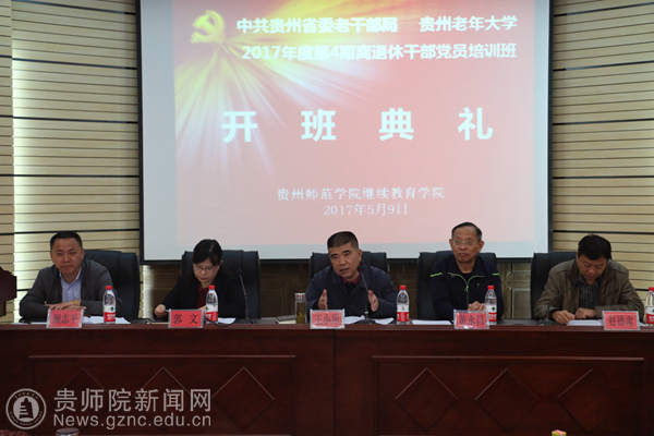 本网讯 5月9日至11日,“中共贵州省委老干部局、贵州老年大学2017年第4期离退休干部党员培训”在继续教育学院举办。开班典礼上,贵州省委老干部局副局长、贵州老年大学党委书记、校长王小乐;贵州省林业厅党组成员、机关党委书记黄永昌;best365手机版官方网站副校长郭文;贵州老年大学老干部党建处处长颜志平等出席了开班典礼。开班典礼由继续教育学院院长赵德肃主持。
