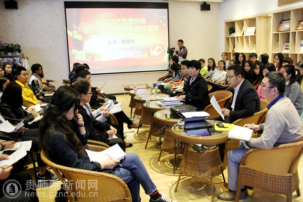 本网讯 4月24日下午,为深入学习贯彻中国共产党贵州省第十二次党代会精神,学工部组织辅导员代表、学生代表在学生事务服务中心书香茶吧举行学习座谈会,会议主要分为两个阶段,第一个阶段由参加此次会议的best365党代表谭丽琼老师为大家宣讲会议精神;第二个阶段由各参会人员谈自己的学习体会。会议由学工部部长薛璞主持。学工部副部长刘讯、辅导员代表及学生代表60余人参加了会议。