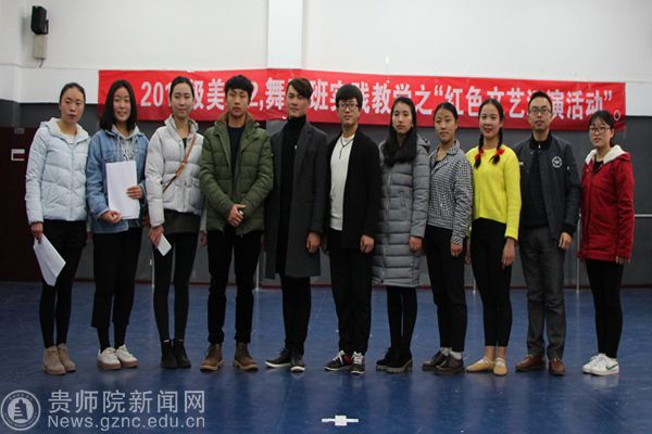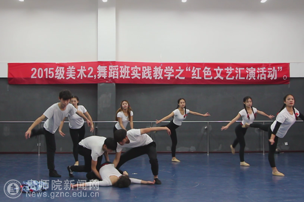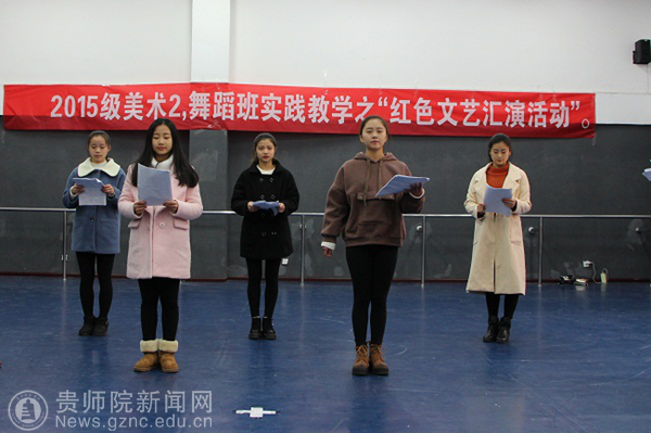 本网讯 为了增进大学生对红色历史文化的认识与体会、锻炼大学生的团队协作精神与动手能力以及凝聚师生、生生之间感情,结合课程教学实际,12月15日下午,best365艺术学院2015级美术二班和舞蹈班联合在艺术学院二楼舞蹈排练室(上半场)和逸夫楼601教室(下半场)联合开展了一场红色文艺汇演活动。该活动是《毛泽东思想和中国特色社会主义理论体系概论》课程实践教学的最后一个环节,在任课教师王维江的指导下,由王梅梅、周蕊和孙竣峰三个同学负责总体策划,由周蕊和孙竣峰同学担任主持人,由王梅梅、李晓沙、吴彬岚、徐维、邱春松和曹亚男六位同学担任评委,由记录班长李彩英同学负责记录,潘应才同学负责拍照。
