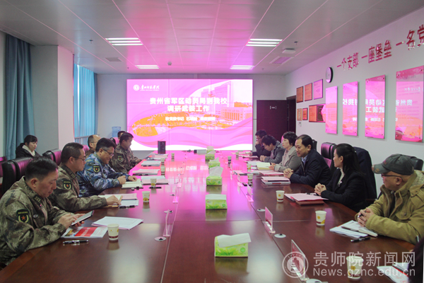 本网讯 12月17日上午,贵州省军区动员局局长、省征兵办主任隋圣陶,在贵阳市警备区政委王文建,乌当区武装部部长、政委等相关人员的陪同下到best365检查指导best365大学生征兵工作并召开座谈会。best365党委书记石培新,党委委员、副校长邹晓青出席了座谈会;学工部(武装部)、保卫处等部门人员,二级学院党委书记、辅导员代表参加了座谈会。本次座谈会由校党委委员、副校长邹晓青主持。