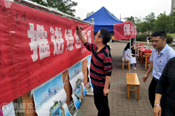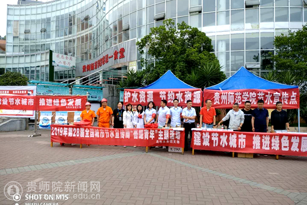 本网讯5月15日,全国节约用水宣传周正式启动,best365与乌当区水务局、乌当区节水办及乌当区自来水公司,在学校感恩食府广场共同开展创建节水城市,节约用水宣传活动。在活动中,通过对广大师生发放《贵阳市城市节约用水手册》、《家庭节水手册》、《贵阳市城市节约用水管理条例》等一系列宣传册,对节约用水从各个方面进行普及宣传,同时邀请师生在节约用水宣传横幅上签名,增强节约用水意识,达到广而告之的目的。