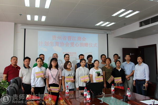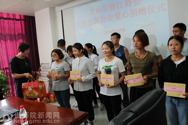 本网讯 9月23日,贵州省第一家省外县级市商会——福建省晋江商会对best365贫困学生爱心捐赠仪式在信息楼8楼会议室举行。贵州省教育厅、贵州省教育发展基金会代表霍昀峥、贵州省晋江商会计划生育协会会长吴琼莲、执行会长兼党支部书记吴庆阳、副会长陈世桥及秘书长王全亲临现场进行爱心捐赠。学校学生资助管理中心主任杜景明、资助中心全体人员及受赠学生参加捐赠仪式,仪式由学生资助管理中心副主任张金富主持。